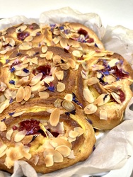 | 200 g smør 6 dl melk 2 pk tørrgjær 800 gr hvetemel 200 gr grov sammalt hvete 230 gram sukker 1 ts salt 3 ts kardemomme 1 ts bakepulver 300 gr friske bringebær Zest fra 1 sitron 300 gr vaniljekrem 50-100 gr mandelflak Fløte til pensling (eller egg eller melk) |