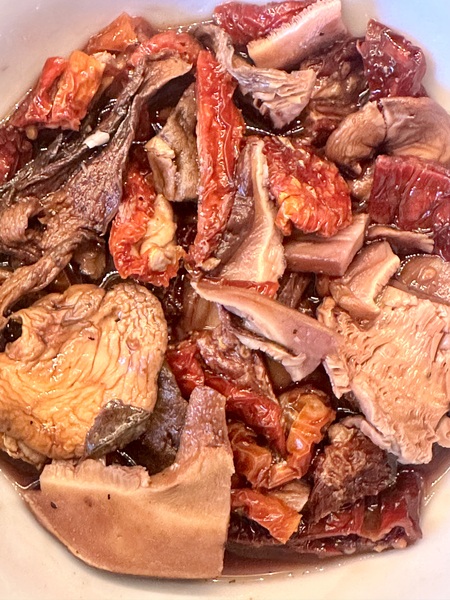 | 1 ss rødvinseddik og 3 ss vann eller 50 ml fruktig rødvin 1 ss bourbon 1 ss sopp-soya 10 gr tørket steinsopp 20 gr soltørket tomat (tørr - ikke i olje) Et par hvitløksfedd 1 sjalottløk Sort malt pepper 75 gr smør 150 gr andelever 2 ss kremfløte |