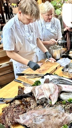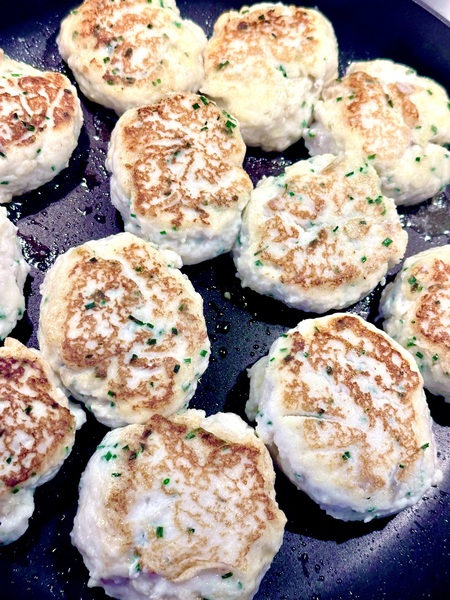 Rens fisken og del i små biter. Kjør fisken noe. Få sekunder i en foodprosessor. Ha i salt. Kjør videre til deig, men ikke for lenge! For kort a lite binding (ikke nok frigjort) - for lenge - for lite binding (i oppløsning). Ha i potetmel og spe litt etter litt med melk og fløte. Stek i en blanding av smør og olje til gjennomstekt. |