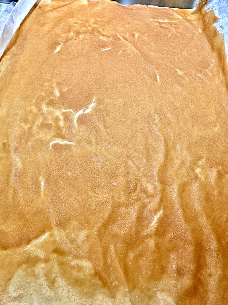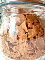 Smelt smør, avkjøl litt. Ha i melis og eggehvite, bland godt. Rør så melet godt inn uten å røre mer enn nødvendig. Smør røren utover et bakepapirkledd bakebrett - så tynt du klarer. Stek i mellom 8 og 12 minutter inntil kjeksen er gylden. Følg godt med så det ikke svir seg. Avkjøl. Knus forsiktig til flak (ikke pulver!) og ha i en tett beholder. |