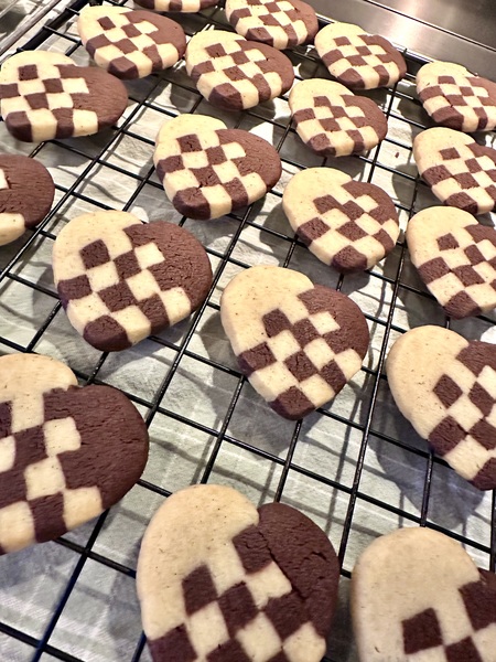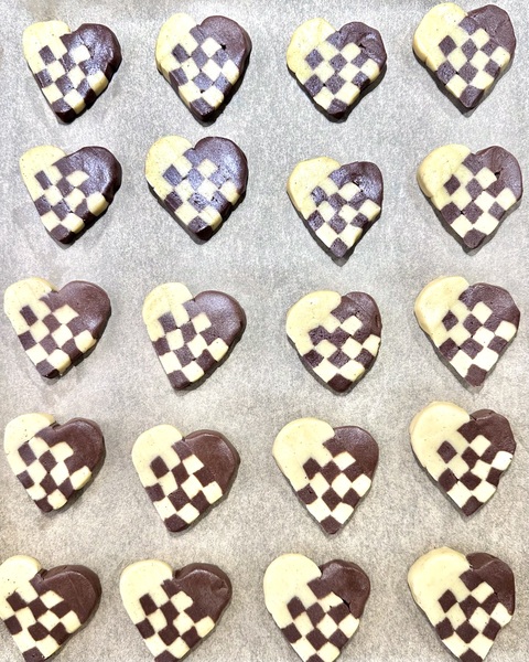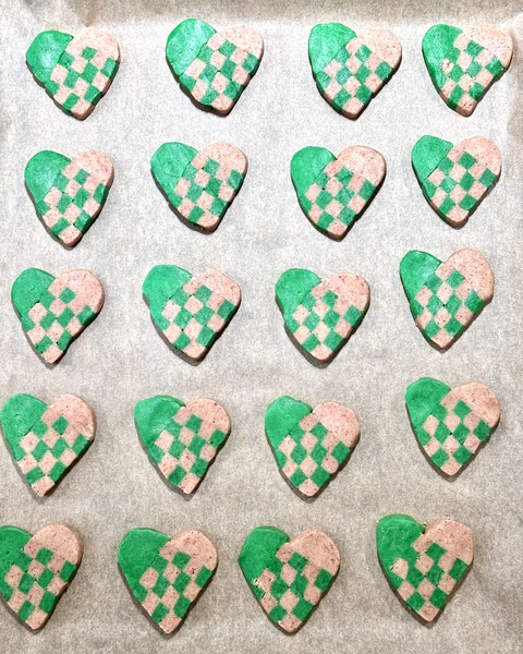 | Kjør romtemperert smør, mel, melis og smaks-/fargekomponent raskt samme i en foodprosessor til sand-konsistens. Hell smulene på et bakeark på benken og kna raskt sammen. Pakk deigen inn i plast og la den hvile i kjøleskapet i minst en time. Kjevle deigen til et jevnt kvadrat på ca 0,4-0,6 cm tykkelse. Skjær så strimler med samme tykkelse og legg annenhver i rutemønster. Dette danner «flettingen» på hjertet. Ta resten av deigen i en farge og rull til en pølse, og del denne i to på langs. Legg den på en av kantene, og gjenta med den andre fargen. Dette danner «toppene» på hjertet. Skjær i tynne skiver og legg på bakepapirkledd bakebrett. Stek på 175 grader i ca 15-17 minutter. De skal være lett lett gyldne i kantene. Avkjøl på rist og oppbevar i tett kakeboks. |